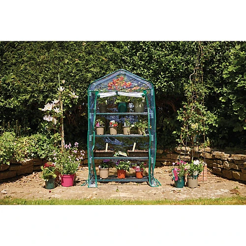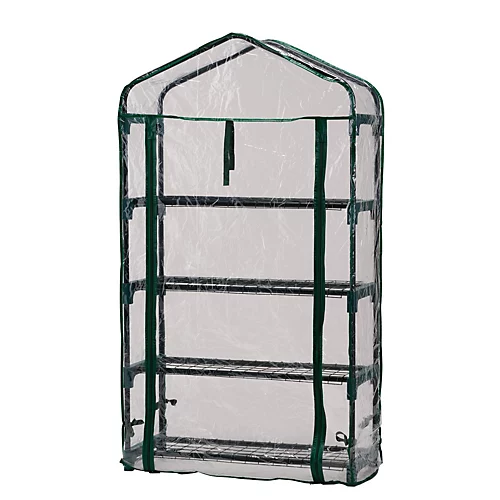 This portable greenhouse offers all the benefits of a full size greenhouse in a smaller and more compact unit. It has a sturdy steel frame and four shelves, providing plenty of room for pots, plants and trays. It is an ideal solution for a small garden, patio, balcony or terrace. The steel frame is powder-coated for durability and corrosion resistance, with mesh shelves to provide safe drainage to prevent plants waterlogging. The shelves are also removable allowing for a variety of plant heights. The robust clear PVC cover encloses the whole structure and acts as a barrier against adverse weather conditions. The zip panel door can be unzipped, rolled open and secured using the hold-up ties to easily water plants, regulate the temperature and encourage pollination. The bottom shelf is raised off the ground to prevent damp and to allow drainage. Suitable for use all year round. Easily assembled.