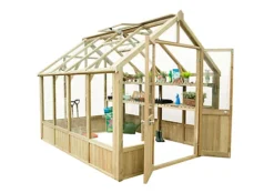 - An attractive, traditional and spacious 10 x 8 greenhouse constructed from high quality pressure treated timber and 4mm toughened glass