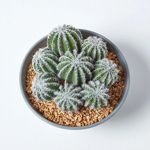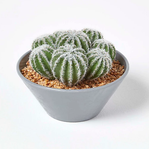 Artificial barrel cactus arrangement in grey plain melamine pot. From Homescapes’ faux plant, flower and tree collection, one of the largest top quality artificial plant collections in the UK, this decorative accessory is hand crafted by skilled experts. Consisting of a cluster of round barrel cacti planted in a pot of faux gravel, each cactus has been carefully crafted from a UV treated polyfoam and decorated with lifelike needles and spines. Measuring 17cm tall and 20cm in diameter, it is the perfect table top decoration, ideal for the office or living space.