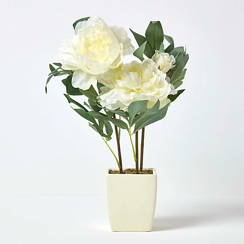 Cream artificial peony, measuring 48cm tall, this elegant cream flower consists of 3 peony heads planted in a matt cream square pot. Handcrafted by skilled artisans, each petal has been hand cut from a silk-like polyester and styled to resemble a real peony flower. A lifelike replica flower that is exclusively designed by Homescapes’, this elegant flower is part of a collection of hundreds of artificial flowers, trees and plants. Suitable for indoor use, this UV resistant plant can be placed on a coffee table or windowsill where it will be loved all year long. To care for your faux plants, simply wipe off any dust or dirt with a damp cloth.