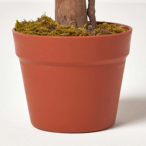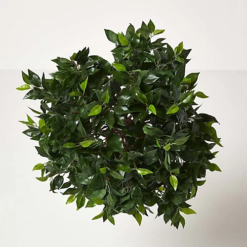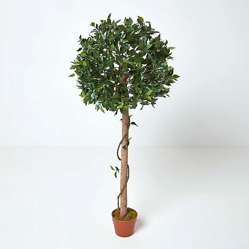 Perfect for the less green fingered gardener, this Green 4 ft Ficus Topiary Artificial Plant from Homescapes is just as beautiful as the real thing, but offers a low-cost, low-maintenance alternative to living houseplants. Showcasing ball-shaped foliage in a distinctive topiary style, this stunning replica Ficus tree has a versatile elegance that makes it ideal for the home, office or a special event. For a life-like appearance, this botanical decoration stands at 125 cm (4’) tall and features a real wood trunk, wrapped with gently trailing vines. It comes supplied in an imitation moss-topped plant pot, so that you can simply shake out the leaves and put your plant to work bringing a natural look to your space, or place it in a decorative container to suit your interior décor.