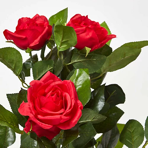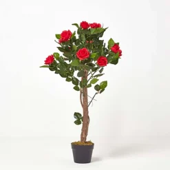 With pretty red blooms and a natural stem for an eye catching, true-to-life appearance, this 3 Ft Red Rose Tree Artificial Plant from Homescapes will help to set a romantic tone for your special occasion, or add a little magic to everyday life. This topiary-style rose bush replica features a generous amount of green foliage and large flower heads in a striking red shade, all standing on a real wood trunk with a winding vine for an authentic look. An English Country Garden classic, an elegant rose tree suits a variety of interior styles, bringing a traditional look to your space. With durable, silk-polyester leaves and petals as well as gently protruding buds, this imitation rose plant looks every bit as striking as the real thing but comes without the trouble of watering or pruning.