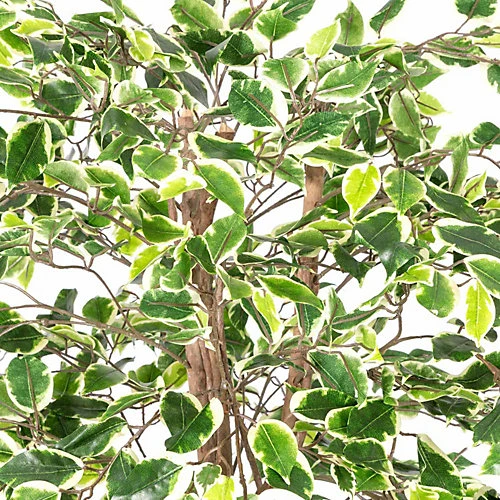- Tall artificial variegated ficus tree with real wood twisted stem and lifelike green leaves in black pot. Size: 6ft (180cm).