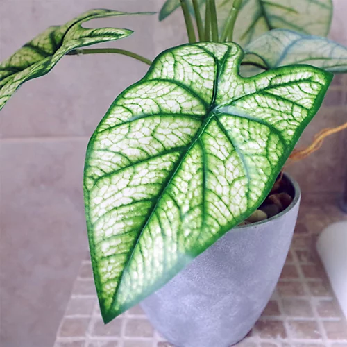 - 40cm artificial taro house plant in decorative planter. Taro plant with photorealistic printed plastic leaves in a decorative plastic planter