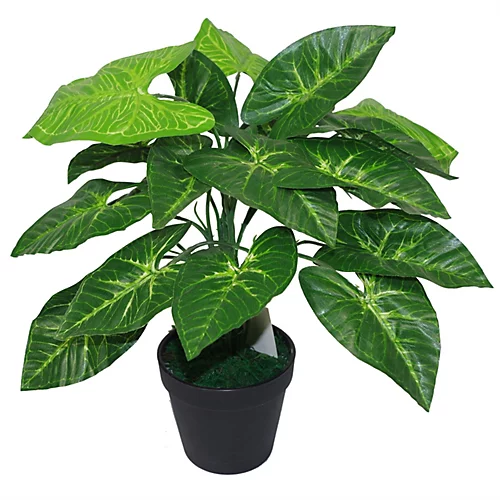 Our artificial plants have realistically shaped leaves. These come ready potted and make ideal artificial houseplants. This artificial plant stands 45cm high as arranged in the photographs. This plant has dark veined leaves as shown. We have the same plant available in a selection of styles and colours (see our other items). It has a moss covered pot. It is highly realistic with botanically accurate foliage. Stems are wired and can be shaped to your requirements. It comes potted in a plain plastic pot and is ready to display. You can easily put this inside a larger planter if you wish. Ceramic planters pictured are for illustration only and are not included. This plant will arrive in a plain black plastic weighted pot covered with moss.