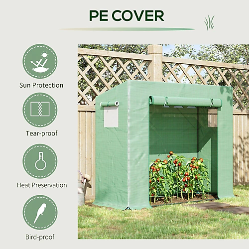 - PLASTIC COAT: Protects plants from the cold and wind outdoors so they can grow to their full potential. large roll-up door to enter and to let in fresh air when required. Long edges to bury in soil and weight down.