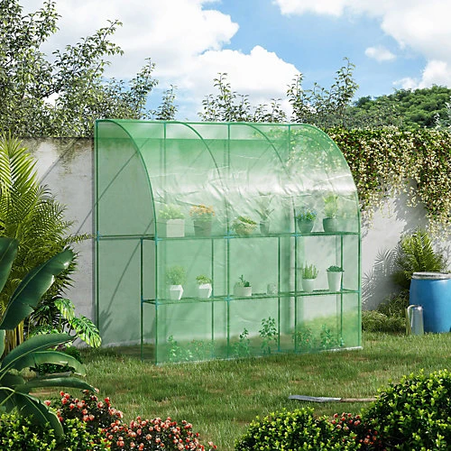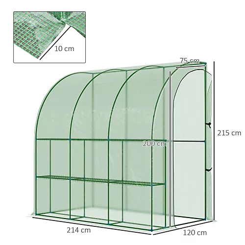 – Perfect for plants, vegetables and flowers; – Leaning design to stand steady against walls and garages; – Zippered roll up door for easy access in and out; – Plastic cover to protect against mild wind and light rain; – Steel frame for a reliable structure; – Guy ropes included to pin to the ground;
