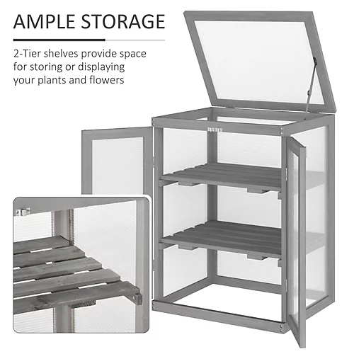 – Stylish and sturdy compact wooden design greenhouse – Fully equipped for outdoor use – Extend growing season and protect young plants from frost – Made from fir wood frame and polycarbonate panels – UV proof polycarbonate walls with flip-top hinged lid – With 2 slatted wood shelves for added storage space – 2 front opening doors – Galvanized metal parts for rust proofing – Assembly required