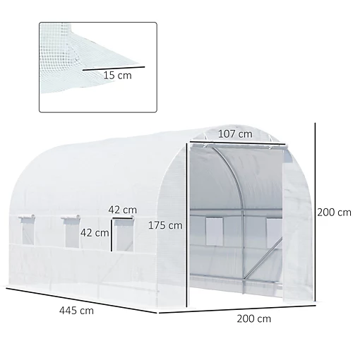 NOTE: Not suitable for bad weather conditions. - -Colour: White ; – Material: Galvanised Steel frame, 140g/m² PE gridding cloth ;-Overall Dimension: 4.5L x 2W x 2H (m) ;-Window Size: 46L x 39W (cm) ;-Door Size: 110W x 190H (cm) ;-Pipe Size: Φ18mm;-Accessory: 4 x pull ropes, 4 x ground nails ;-Custom Label: 845-073;-NOTE: Not suitable for bad weather conditions;