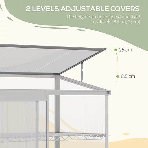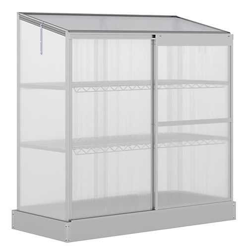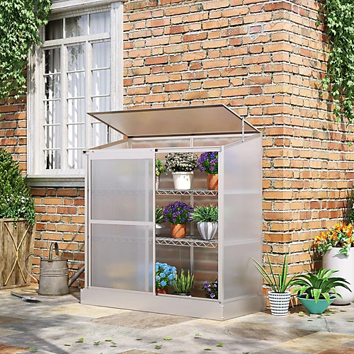 Give your plants and vegetables somewhere to enjoy the sunshine and grow heartily, thanks to this Aluminium Greenhouse from Outsunny. Small aluminium cold frame provides strength, with the polycarbonate panels protecting the inside from medium wind and rain, whilst allowing the sunlight to pass through. Inside two shelves are placed for organisation, with a lift-up lid and sliding door for easy access.