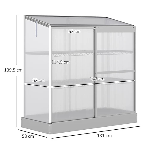 - – Brand: Outsunny; – Colour: Silver; – Materials: Polycarbonate, aluminum and galvanized steel; – Dimensions: 140.5H x 129.5L x 58Wcm. Door: 114.5H x 62Wcm. Shelves: 73Hcm, 105.5Hcm and 127Hcm. Single later:123L x 52Wcm. Foundation: 11.8H x 129.5L x 58Wcm; – Maximum load: 30kg per tier; – Custom label: 845-329;