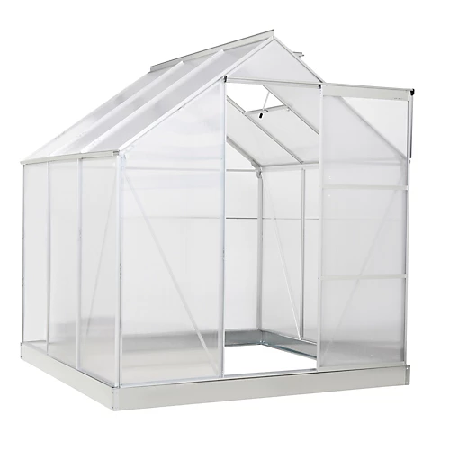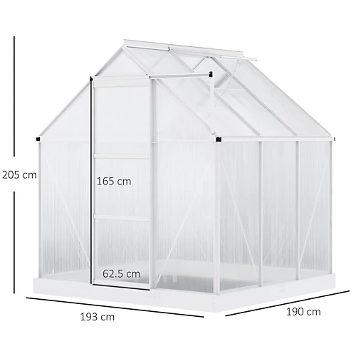 - – Item Name: Greenhouse; – Brand Name: Outsunny; – Colour: Silver; – Materials: Aluminium, galvanised steel and polycarbonate; – Dimensions: 193W x 187D x 205Hcm. Door: 165H x 62.5Wcm. Window: 58L x 51W cm. Foundation: 11.7Hcm. Panels: 4Dmm. – Panels UV rating: 30um; – Flat pack: Yes; – Custom label: 845-334V01;