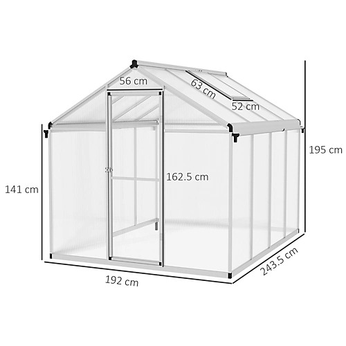 – Lightweight yet rust-resistant aluminium frame with sturdy hardware, alongside reinforced poles for extra support; – 4mm double-wall panels keep the heat in effectively, as well as allowing sunlight to reach your plants, flowers and herbs to promote healthy, all-year round growth; – Tilted roof with rain gutters so liquids don’t build up and stagnate; – Large, single door, provides easy access in and out; – One window for good ventilation; – The door can be locked; – Assembly required;