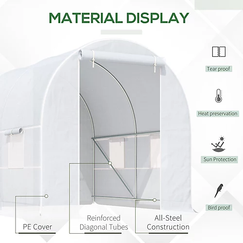- PE COVER: Garden polytunnel’s fully closed UV protection PE cover maintains high humidity levels for growing tropical plants and allows nourishing sunlight to pass through. The 15 cm extended edges are supposed to be deeply buried in the soil to tighten the tunnel greenhouse cover for more stability