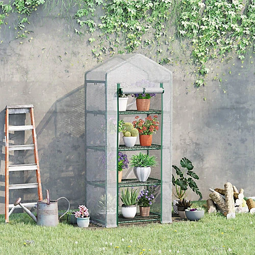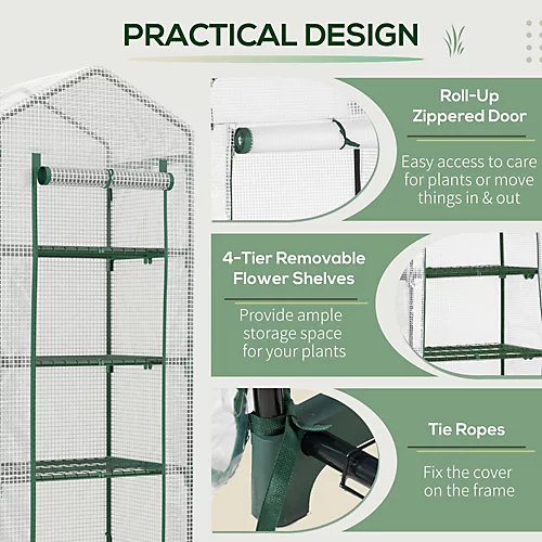 – Durable PE cover to allow sunlight to your plants, flowers and vegetables; – Protect plants from heat or cold and pests; – 4 tiers shelves for putting plants, flowers, vegetables and fruits; – Portable and compact design for ideal balconies and patios; – Sturdy powder coated steel frame for reliable use; – Zipped roll-up door for quick and easy access; – Assembly required;