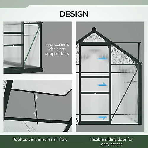 The Outsunny polycarbonate green house is perfect for the home gardening enthusiast. The walk in greenhouse’s powder-coated aluminium frame and sheets will keep your plants, vegetables, and more safe. Heavy-duty greenhouse’s rooftop vent ensures excellent ventilation for your unit. A convenient single sliding door design provides easy access to the transparent greenhouse inside. Our Outsunny outdoor greenhouse is the ideal solution for keeping your plants healthy throughout the year.