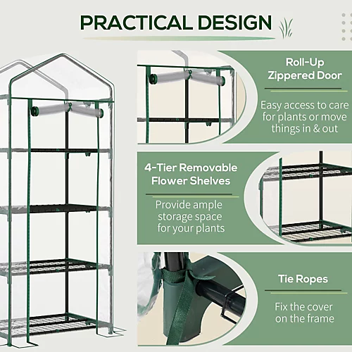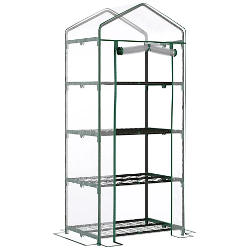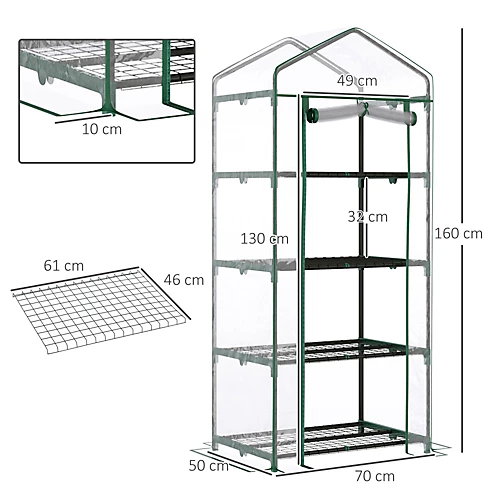 NOTE: Not suitable for bad weather conditions. - – Item Name: Greenhouse; – Brand Name: Outsunny; – Material: Steel Tube, PVC Cover; – Net Weight: 4.5kg; – Colour: Dark Green and Transparent; – Overall Dimension: 70Lx50Wx160H (cm); – Tier Height: 35cm; – Max Load (each tier): 15kg; – Flat Pack: YES; – Custom Label: 845-228V03; – NOTE: Not suitable for bad weather conditions;