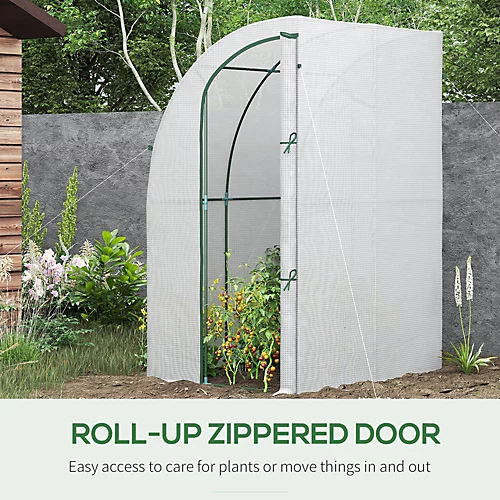 – Perfect for plants, vegetables and flowers; – Leaning design to stand steady against walls and garages; – Zippered roll up door for easy access in and out; – UV-resistant Plastic cover to protect against mild wind and light rain; – Steel frame for a reliable structure; – 4 guy ropes and 4 ground nails included to pin to the ground; – Assembly required;