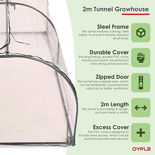 The tunnel has a sturdy tubular steel frame and heavy-duty polythene cover with a roll-up zipped door which not only provides easy access, but ventilation in the warmer months. The cover has 10cm excess at the bottom which can be buried to provide extra security in storms and strong winds.