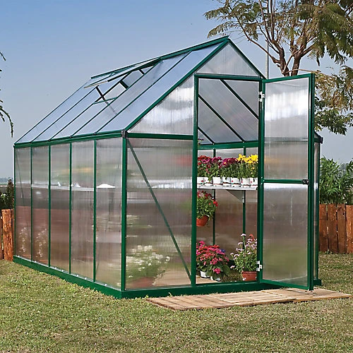 The Palram Mythos Greenhouse is a sleekly designed greenhouse. It helps you to maintain level temperatures and diffuse sunlight for sensitive plants. It features robust, twin-wall polycarbonate panels, and a heavy-duty green powder coated, rust resistant aluminium frame.