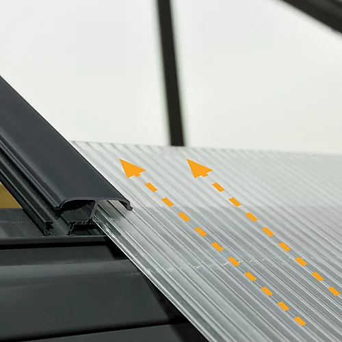 Merged glazing system: 4mm Twin Wall polycarbonate roof panels and clear as glass side panels