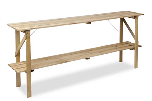 This fantastically useful fold away wooden staging for all of your garden needs. The versatile and table unit is great for shelving or as a worktop. The worktop will help you clear clutter in an attractive way, whilst also offering the convenience of folding away when not in use. The treated pine means it will look at home on patios, sheds, greenhouse and more.
