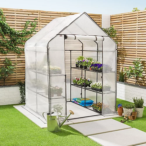 Propagate seeds and grow your own plants and flowers with this Christow Walk-In Reinforced Greenhouse. Perfect for gardens that are short on growing space, it features eight wire shelves to accommodate growth and enough space to stand inside when tending to your plants and flowers. Once the frame has been assembled, slip the cover over the top and you’re all good to grow. The cover consists of an internal grid sandwiched between two layers of polyethylene. This reinforced design offers superior durability, stability and insulation than standard PVC. Guylines, pegs and U-pins allow to secure the greenhouse to the ground for greater wind-resistance. Features & Specifications: Easy assembly – powder-coated tubular steel poles and plastic connectors. PE cover allows plants to absorb sunlight during the day whilst insulating them at night. Roll-up zipped door. 8 shelves. Guylines, pegs and U-pins. Size: H195cm x W143cm x D143cm.