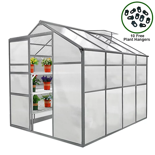 This glorious green house is constructed with a thick aluminium frame and high-density polycarbonate sheets. The shatterproof twin wall pc sheets help protect your plants from UV rays, whilst letting you admire their beauty from the outside.
